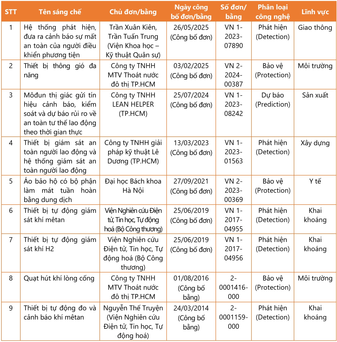 Bảng 1. Các sáng chế, giải pháp hữu ích về công nghệ hỗ trợ an toàn lao động tại Việt Nam