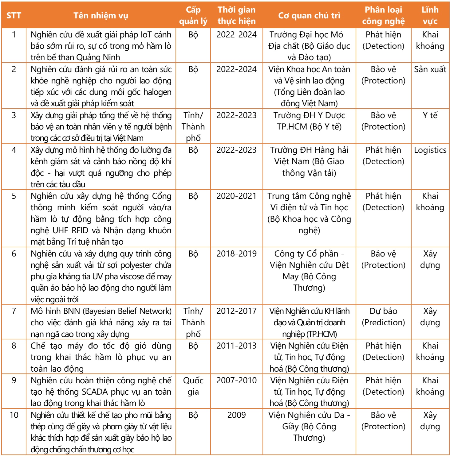 Bảng 2. Các nhiệm vụ KH&CN về công nghệ hỗ trợ an toàn lao động tại Việt Nam