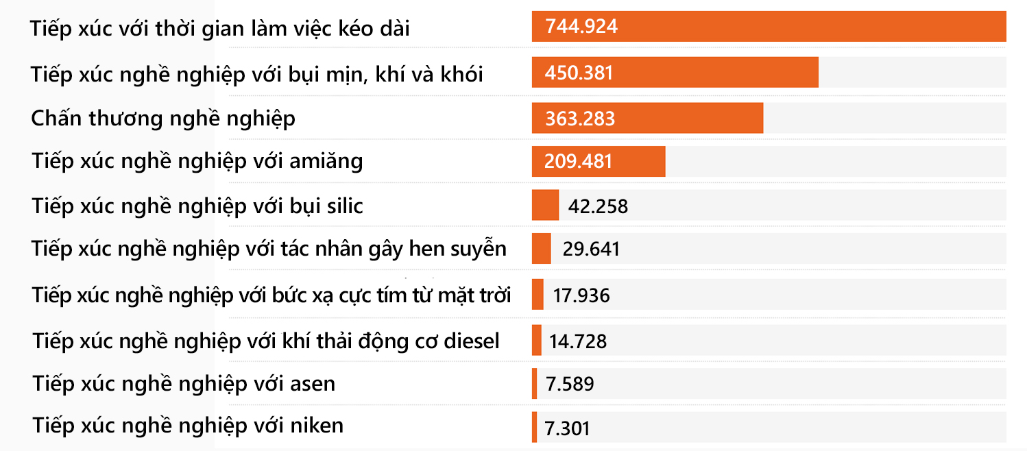Theo thống kê năm 2023 từ Tổ chức Lao động Quốc tế (International Labour Organization - ILO), có hơn 2,93 triệu người tử vong hàng năm do tai nạn lao động hoặc bệnh liên quan đến công việc; 395 triệu trường hợp thương tích không tử vong tại nơi làm việc, tương đương với hơn một triệu trường hợp thương tích mỗi ngày và làm hao hụt ít nhất bốn ngày nghỉ làm mỗi năm. Xem xét các yếu tố rủi ro nghề nghiệp phổ biến nhất, Tổ chức Y tế Thế giới (World Health Organization - WHO) và ILO đã xác định Tiếp xúc với thời gian làm việc dài (≥55 giờ mỗi tuần) là nguyên nhân tử vong nhiều nhất, cướp đi sinh mạng của gần 745.000 người vào năm 2016, kế đến là Tiếp xúc với các hạt vật chất, khí và khói (450.000 ca tử vong) và Chấn thương nghề nghiệp (363.000 ca tử vong).