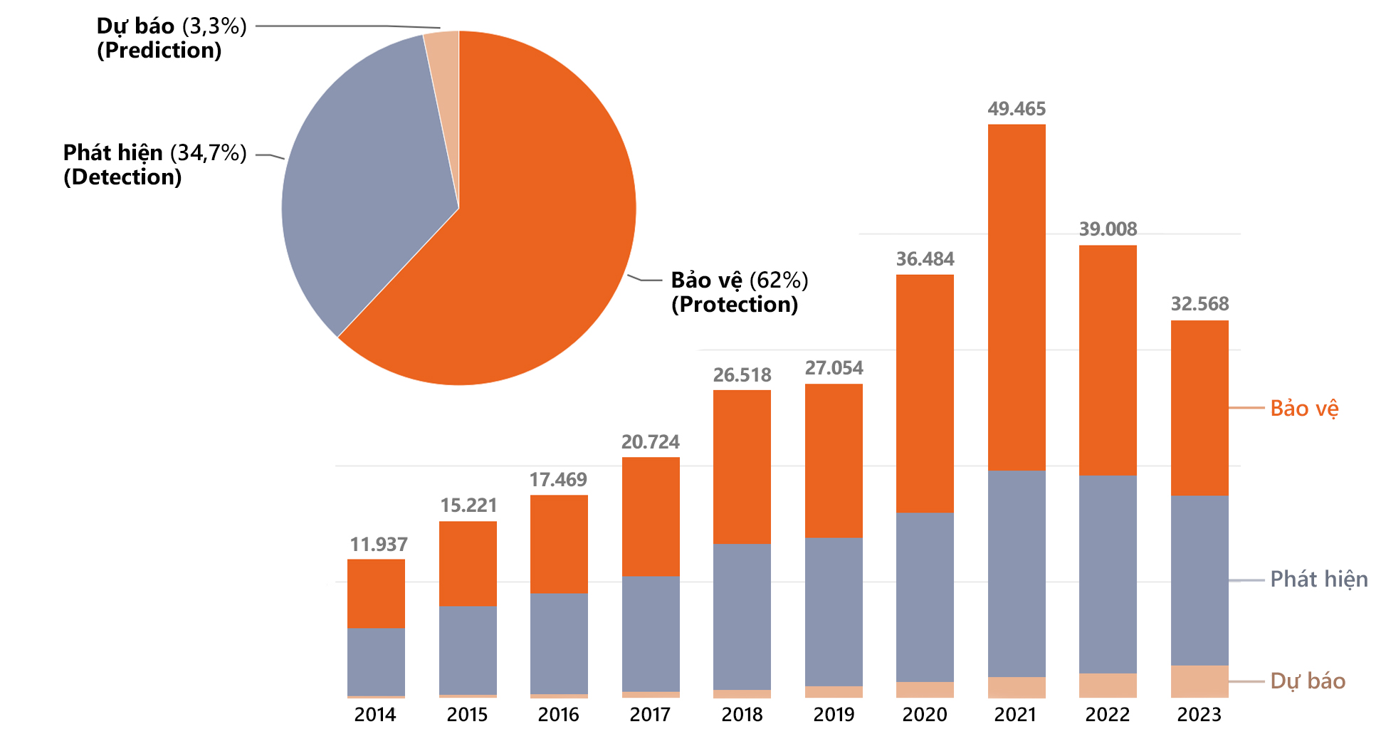 Chia theo loại hình công nghệ, các sáng chế liên quan đến công nghệ Bảo vệ (Protection) có số lượng nhiều nhất với 280.686 họ sáng chế, chiếm tỷ lệ 62% tổng tập dữ liệu OHS, đứng thứ hai là các sáng chế liên quan đến công nghệ Phát hiện (Detection) với 157.183 họ sáng chế, chiếm 34,7% tập dữ liệu OHS và thấp nhất là các sáng chế liên quan đến công nghệ Dự báo (Prediction) với 14.777 họ sáng chế, chiếm 3,3% tập dữ liệu OHS. Mặc dù có số lượng khá ít, nhưng công nghệ Dự báo có CAGR từ năm 2014-2023 đạt mức 33,4%, cao hơn gấp ba lần so với các nhóm công nghệ Bảo vệ và Phát hiện (chỉ đạt mức xấp xỉ 11% trong cùng giai đoạn).