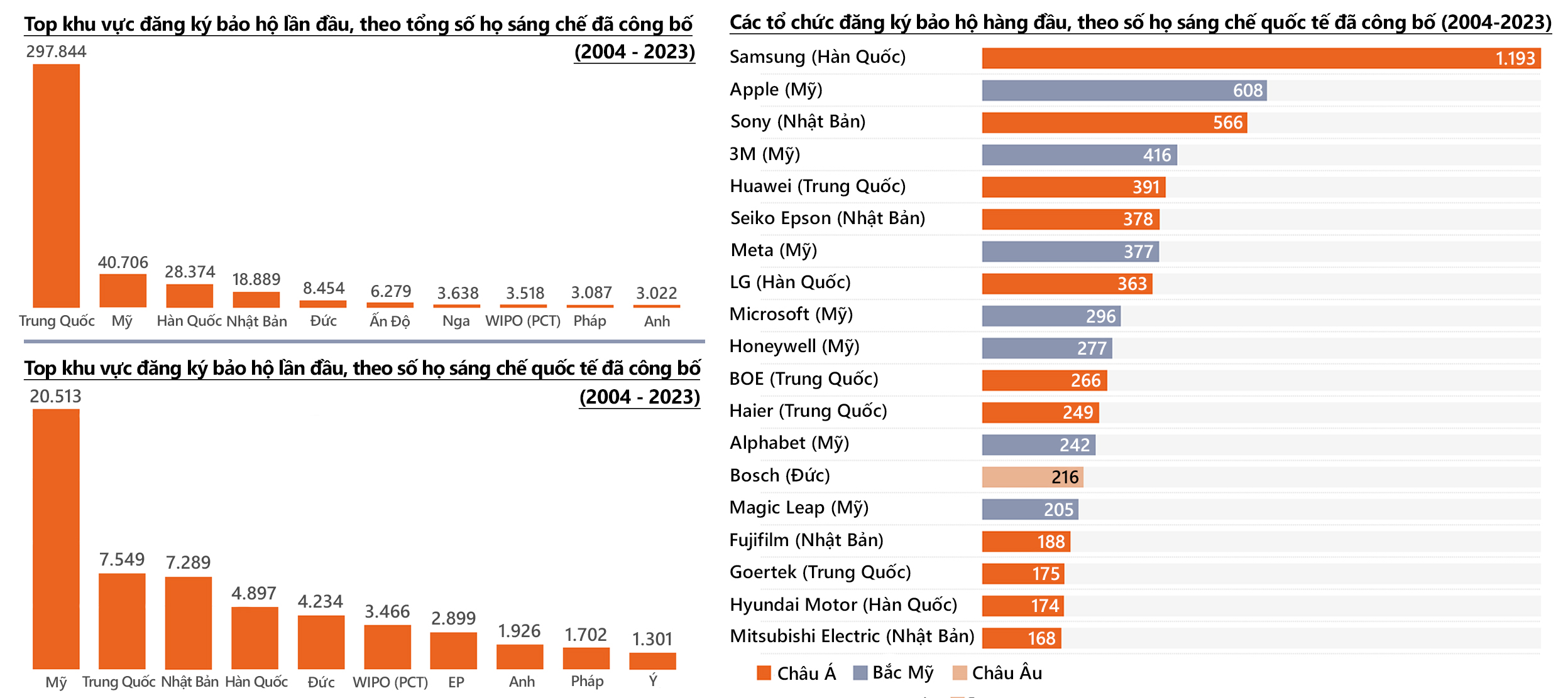 Số lượng họ sáng chế quốc tế chia theo quốc gia và tổ chức đăng ký bảo hộ trong giai đoạn 2004-2023