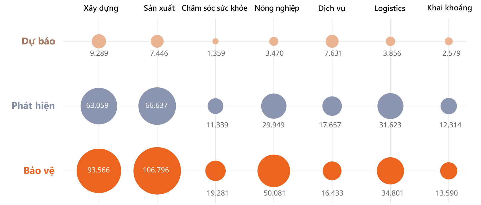 Theo dữ liệu của WIPO, các nghiên cứu về OHS có xu hướng tập trung nhiều trong những ngành có rủi ro nghề nghiệp cao như: sản xuất, xây dựng và nông nghiệp. Trong đó, công nghệ Dự báo mặc dù có lượng sáng chế thấp nhưng cho thấy những đóng góp đáng kể trong ngành xây dựng và dịch vụ; còn nhóm công nghệ Bảo vệ và công nghệ Phát hiện tập trung chủ yếu vào ngành sản xuất, xây dựng, nông nghiệp và logistics, cho thấy sự quan tâm đến các biện pháp an toàn tại nơi làm việc và các hệ thống giám sát an toàn theo thời gian thực.