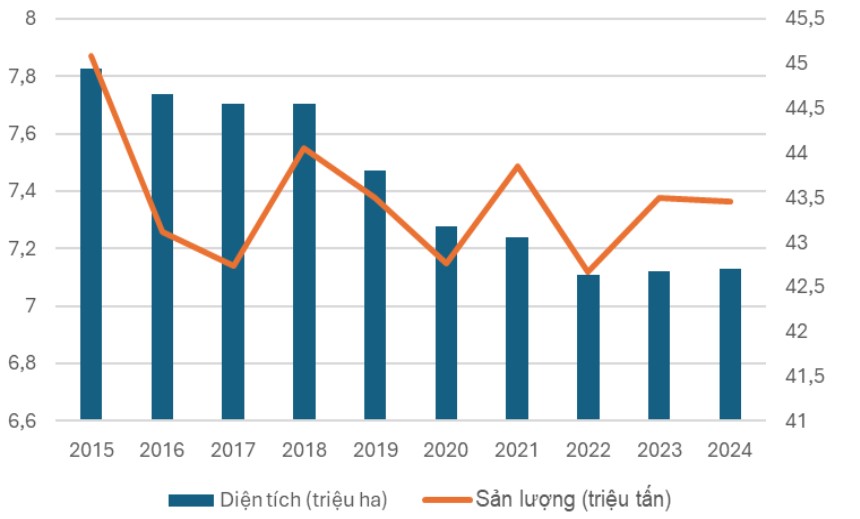 Theo số liệu từ Niên giám thống kê năm 2024 của Tổng cục Thống kê, giai đoạn 2015-2024, diện tích trồng lúa của Việt Nam có xu hướng giảm dần, từ hơn 7,8 triệu ha năm 2015 xuống còn khoảng 7,1 triệu ha năm 2024. Dù vậy sản lượng lúa vẫn giữ ở mức ổn định, dao động quanh 43–44 triệu tấn mỗi năm. Điều này cho thấy ngành lúa gạo Việt Nam đang chuyển dịch theo hướng nâng cao năng suất và chất lượng sản phẩm.