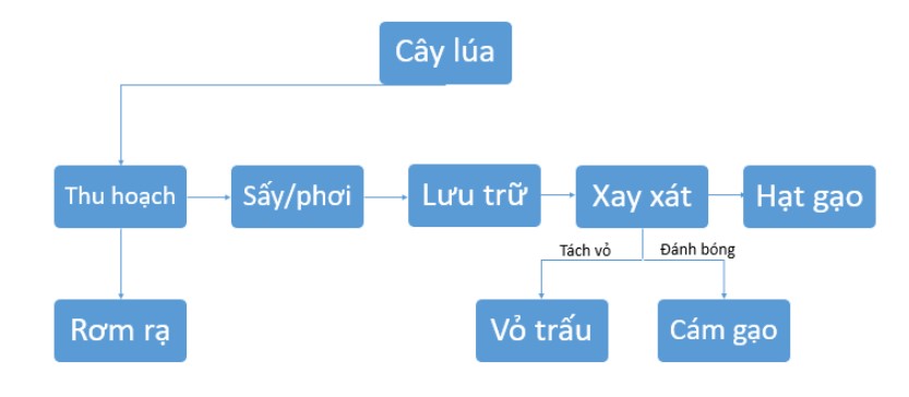 Theo Viện Nghiên cứu Lúa gạo Quốc tế (IRRI), quá trình sản xuất lúa gạo trải qua nhiều công đoạn, từ trồng trọt, thu hoạch, phơi hoặc sấy để giảm độ ẩm, đến bảo quản và cuối cùng là xay xát. Trong đó, xay xát là khâu quan trọng nhằm loại bỏ lớp vỏ trấu và cám để thu được hạt gạo sạch, không lẫn tạp chất và có thể sử dụng. Ngoài hạt gạo là sản phẩm chính, quá trình sản xuất lúa gạo còn tạo ra ba loại phụ phẩm chính là: rơm rạ (phần thân và lá cây lúa sau thu hoạch), vỏ trấu (lớp bảo vệ bên ngoài hạt lúa, bị loại bỏ khi xay xát), và cám gạo (lớp vỏ mỏng nằm giữa vỏ trấu và hạt gạo, giàu dưỡng chất, tách ra trong quá trình xay xát và đánh bóng).