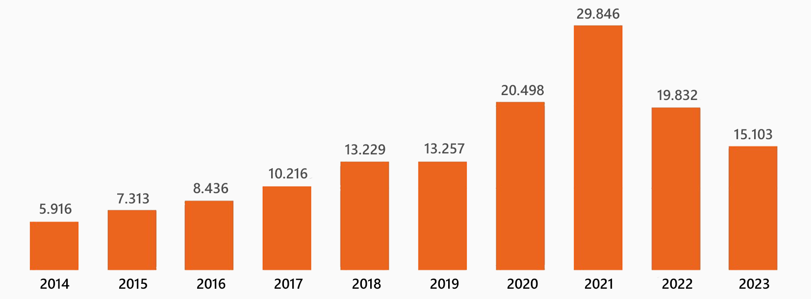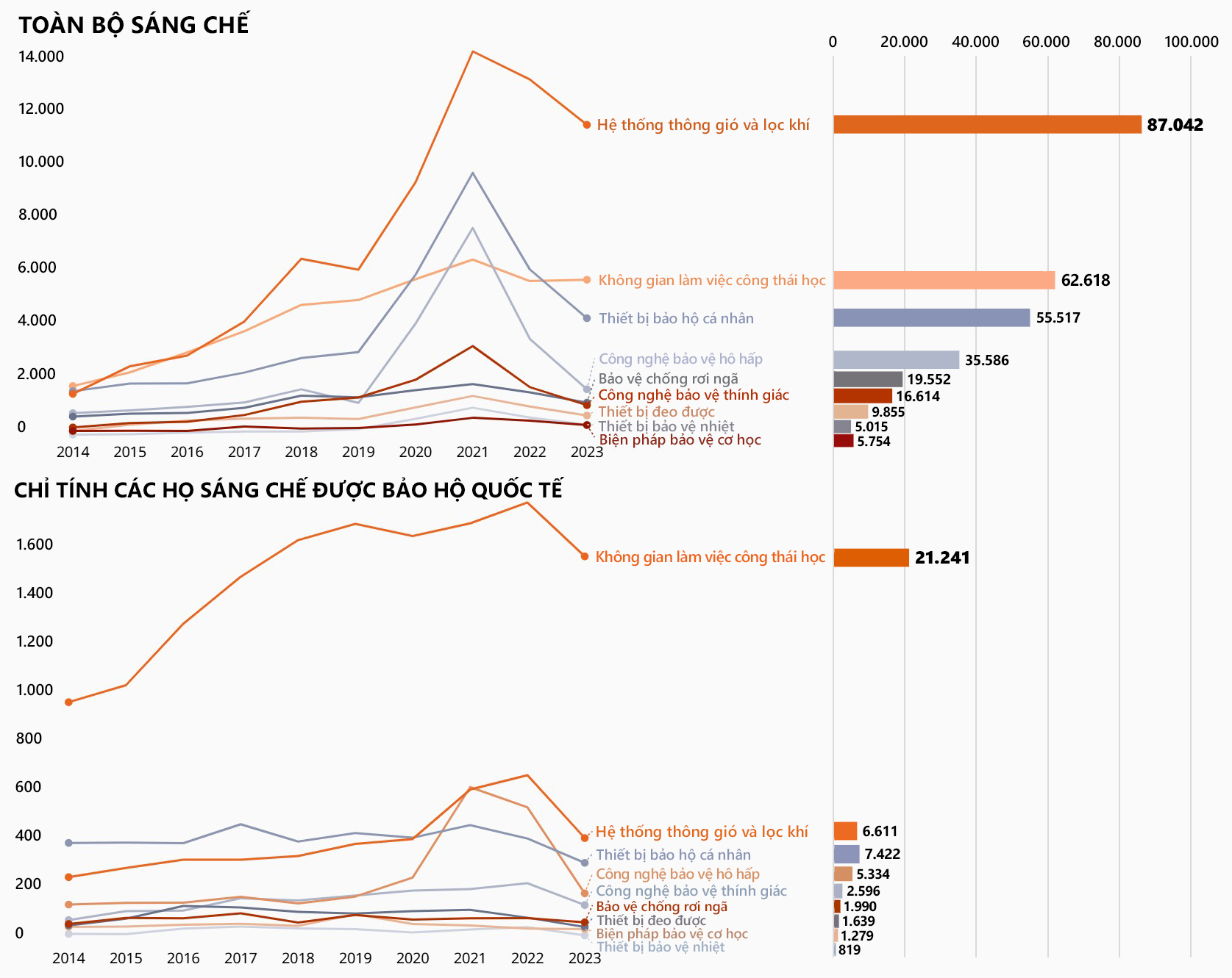 Mặc dù tốc độ tăng trưởng kép hàng năm (CAGR) của các sáng chế trong giai đoạn 2014-2023 có sự sụt giảm nhẹ (-1,3%), nhưng lĩnh vực này vẫn thu hút nhiều nghiên cứu trên thế giới, cho thấy mức độ quan tâm đổi mới công nghệ an toàn lao động tại nơi làm việc.