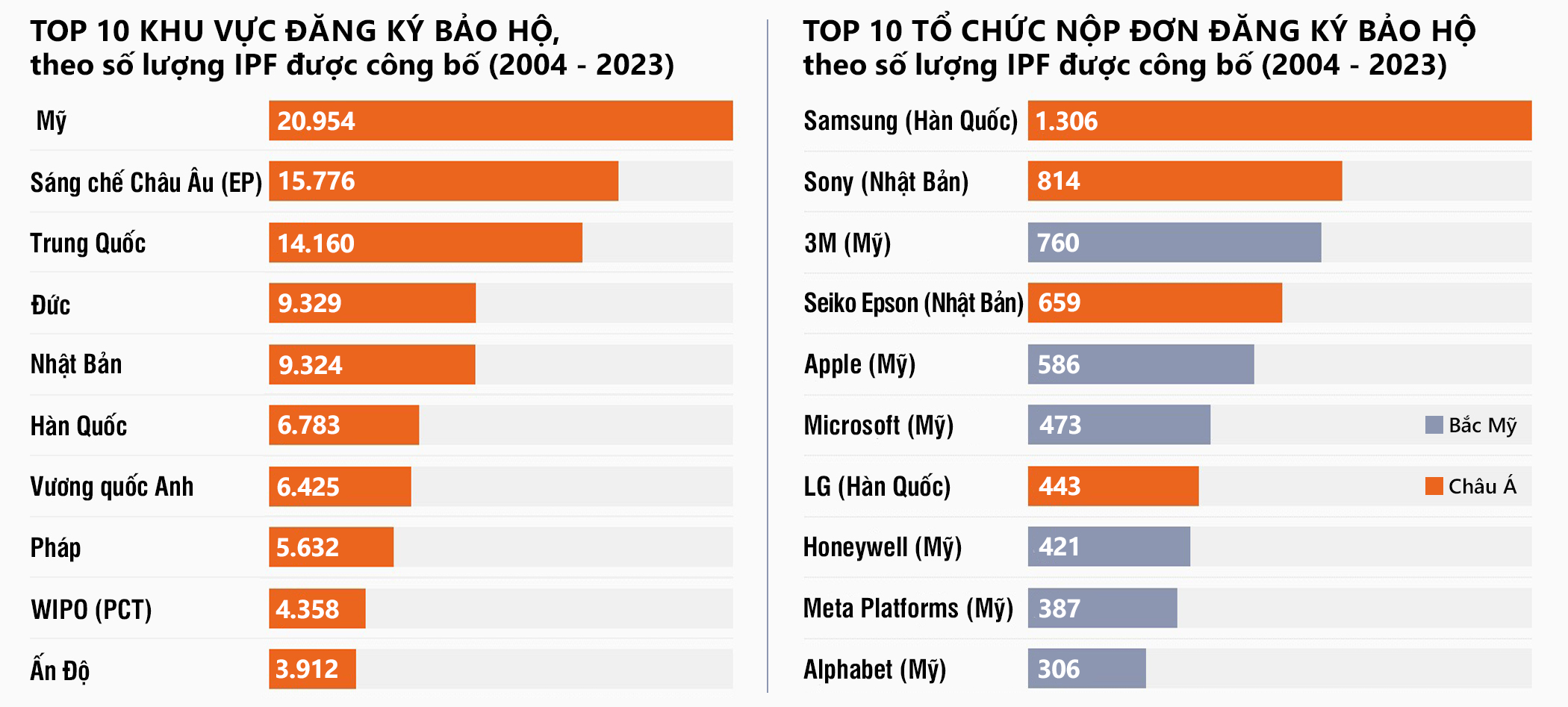 Theo khu vực đăng ký bảo hộ, Hoa Kỳ, Châu Âu, Trung Quốc, Đức, Nhật Bản và Hàn Quốc là những khu vực được nhắm mục tiêu trong chiến lược đăng ký bảo hộ sáng chế quốc tế. Trong đó, Mỹ dẫn đầu với 20.954 IPFs, đứng thứ hai là Văn phòng Sáng chế Châu Âu với 15.776 IPFs, đứng thứ ba là Trung Quốc với 14.160 IPFs. Các khu vực và quốc gia này được ưu tiên đăng ký sở hữu trí tuệ vì có hệ sinh thái công nghệ và cơ hội thương mại hóa mạnh mẽ.