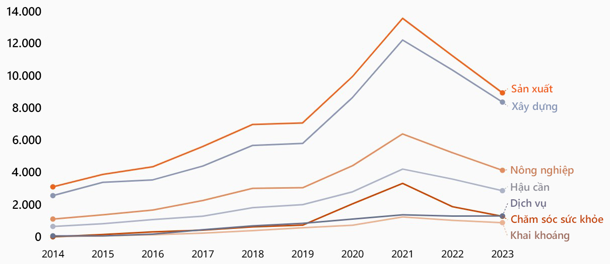 Theo ngành công nghiệp, xây dựng và sản xuất là hai lĩnh vực chiếm ưu thế về khối lượng sáng chế và đạt đỉnh vào năm 2021, nhưng sau đó là sự sụt giảm mạnh vào năm 2023. Ngược lại, các ngành nông nghiệp, hậu cần và dịch vụ có số lượng sáng chế khiêm tốn hơn nhưng lại cho thấy mức tăng trưởng ổn định trước năm 2021 và chỉ giảm nhẹ sau đó, phản ánh sự đổi mới bền vững nhưng chưa có sự đột phá. Đối với ngành chăm sóc sức khỏe, giai đoạn 2014-2019 ghi nhận mức tăng ổn định, nhưng từ năm 2020 số lượng sáng chế tăng vọt và đạt đỉnh năm 2021, rồi dần giảm trở lại. Còn ngành khai thác mỏ duy trì mức tăng trưởng tương đối ổn định trong suốt giai đoạn 2014-2023, cho thấy sự tập trung bền bỉ vào việc nâng cao an toàn lao động.