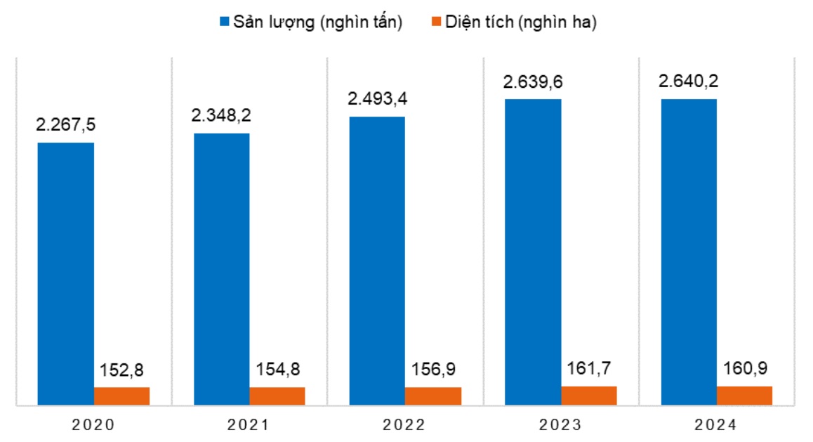 Theo Niên giám Thống kê năm 2024, giai đoạn 2020-2024, chuối luôn giữ vị trí dẫn đầu về diện tích trồng trong nhóm cây ăn quả. Diện tích tăng từ 152,8 nghìn ha năm 2020 lên 161,7 nghìn ha năm 2023, trước khi giảm nhẹ xuống 160,9 nghìn ha năm 2024. Về sản lượng, chuối duy trì tốc độ tăng trưởng ổn định, từ 2.267,5 nghìn tấn năm 2020 lên 2.640,2 nghìn tấn năm 2024. Những con số này khẳng định vai trò chủ lực của cây chuối trong cơ cấu cây ăn quả của Việt Nam.