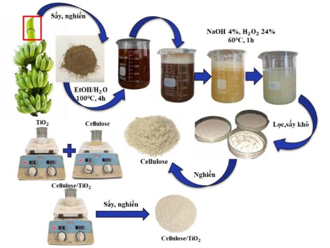 Quy trình tổng hợp vật liệu cellulose/TiO₂ từ cuống buồng chuối (Nguồn: Kết quả nghiên cứu)