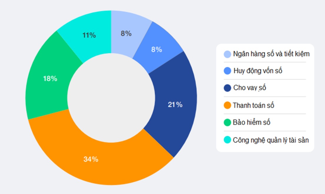 Báo cáo tập trung vào sáu ngành chính trong fintech hướng tới khách hàng bán lẻ, và lần này bổ sung công nghệ quản lý tài sản. Trong đó, thanh toán kỹ thuật số là lĩnh vực lớn nhất với 34% số phản hồi, tiếp đến là cho vay kỹ thuật số (21%), công nghệ bảo hiểm (18%) và quản lý tài sản kỹ thuật số (11%). Huy động vốn kỹ thuật số và ngân hàng, tiết kiệm kỹ thuật số chiếm 8% mỗi loại.