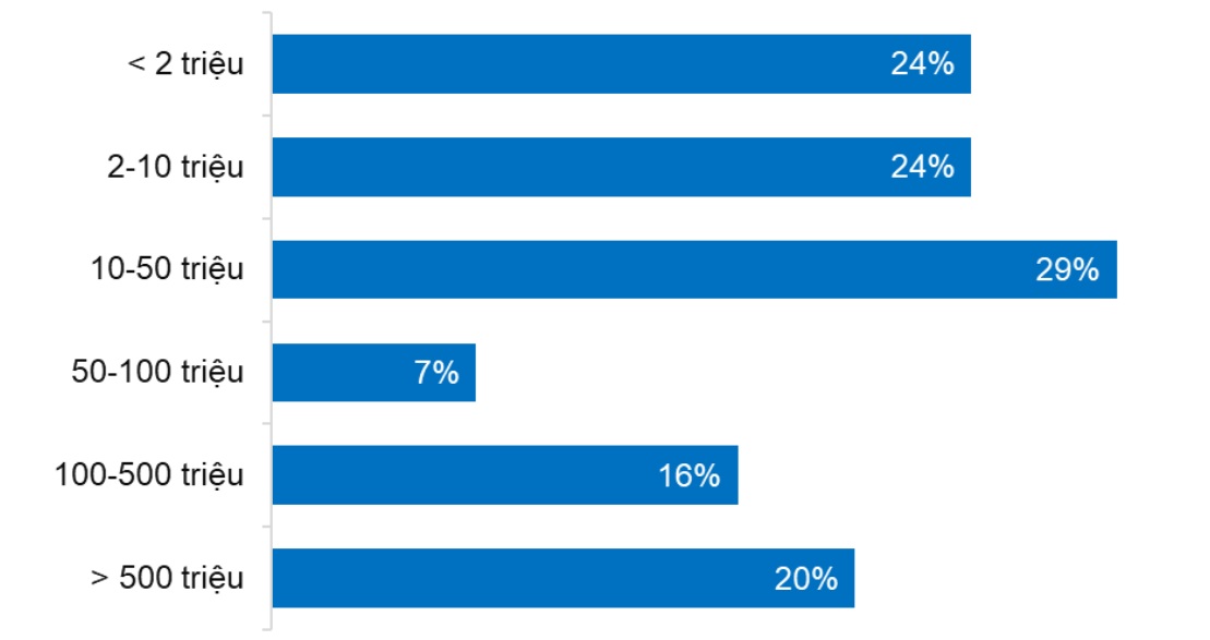 Về doanh thu, 48% công ty fintech có tổng doanh thu hàng năm trong khoảng dưới 2 triệu đô la đến 10 triệu đô la, mỗi nhóm chiếm 24%. 26% công ty có doanh thu từ 10 đến 100 triệu đô la, trong đó 19% từ 10-50 triệu và 7% từ 50-100 triệu đô la. 16% có doanh thu từ 100-500 triệu đô la và 10% trên 500 triệu đô la. Điều này cho thấy đa phần các công ty fintech đang duy trì mức doanh thu nhỏ đến vừa nhưng vẫn ổn định.