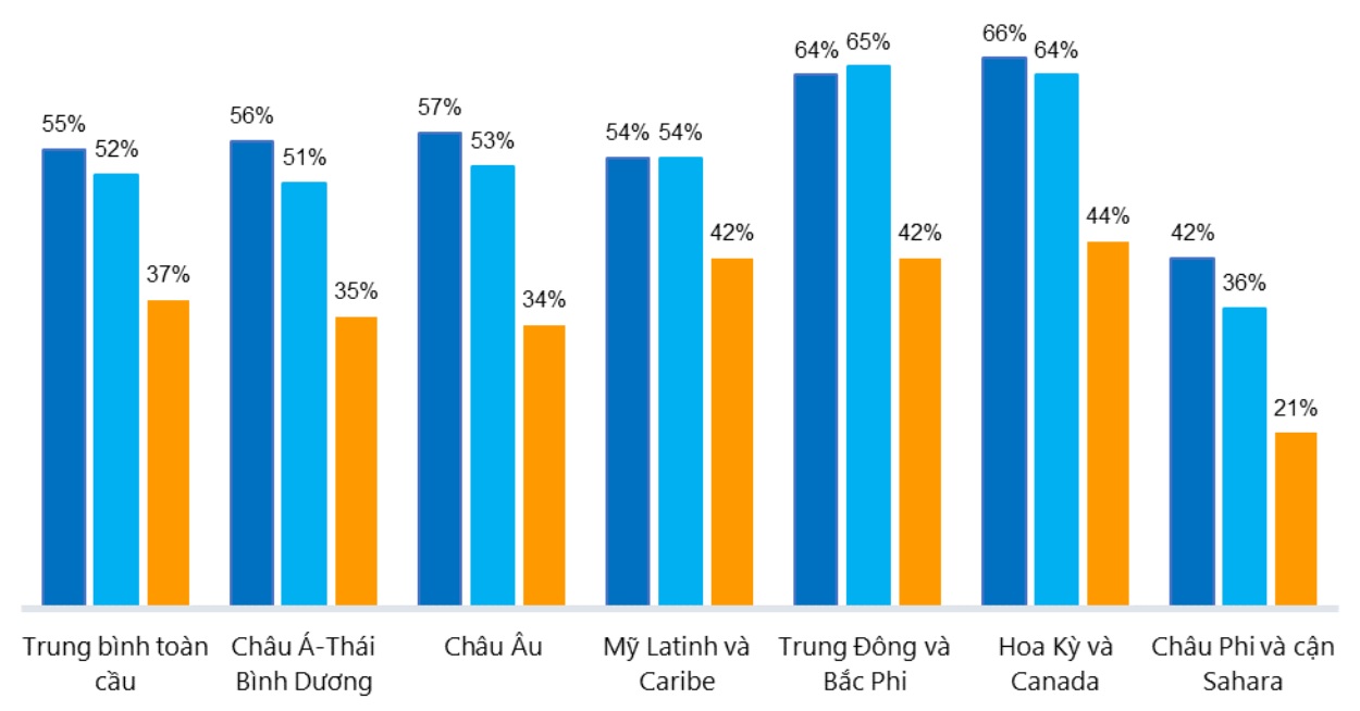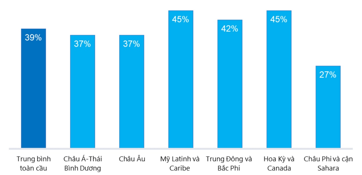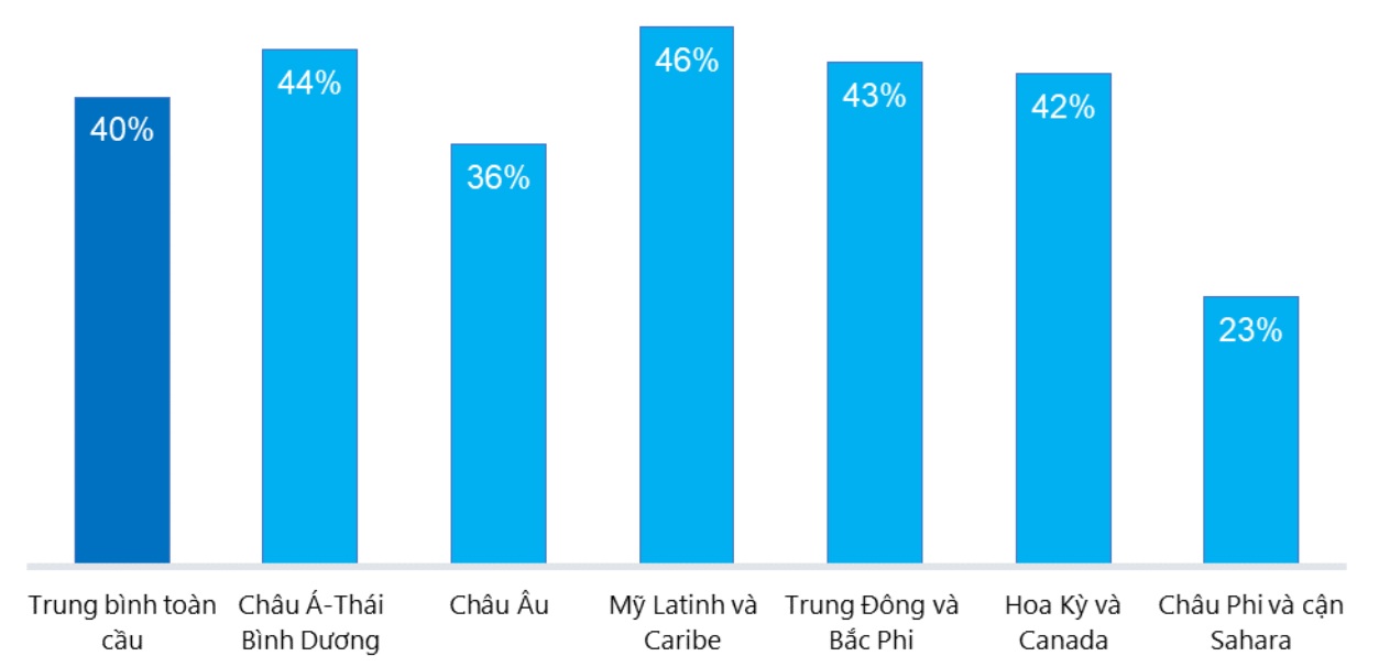 Tăng trưởng lợi nhuận: Tỷ lệ tăng trưởng lợi nhuận của ngành công nghệ tài chính năm 2023 đạt trung bình 39%, trong đó các khu vực như LAC, Hoa Kỳ và Canada có mức tăng trưởng cao nhất, khoảng 45%, tiếp theo là MENA với 42%. Khu vực APAC và châu Âu cùng đạt mức khoảng 37%, gần mức trung bình. Ngược lại, khu vực SSA có tốc độ tăng trưởng thấp nhất ở mức 27%, do chịu ảnh hưởng bởi các khó khăn kinh tế và hạn chế về cơ sở hạ tầng.