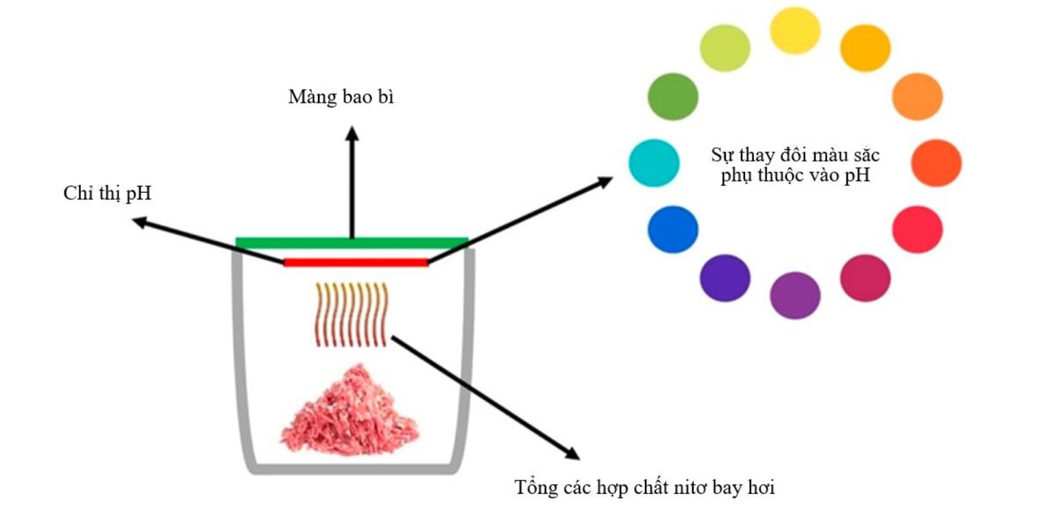 Sự thay đổi màu sắc của màng chỉ thị khi phản ứng với sự biến đổi pH của thực phẩm do sự hình thành các hợp chất bay hơi. (Nguồn: Biên dịch từ bài báo khoa học “Recent Advances in Intelligent Food Packaging Applications Using Natural Food Colorants” (Ruchir Priyadarshi và cộng sự, 2021)