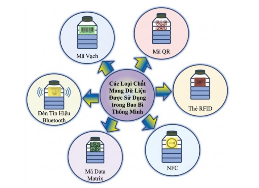 Một số loại phương tiện mang dữ liệu bao gồm mã vạch, mã QR, thẻ RFID, NFC, mã ma trận dữ liệu và các thiết bị phát Bluetooth được sử dụng trong bao bì thông minh. (Nguồn: Biên dịch từ bài báo khoa học “Data carriers for real-time tracking and monitoring in smart, intelligent packaging applications: A technological review” (Annu Kumari và cộng sự, 2025)
