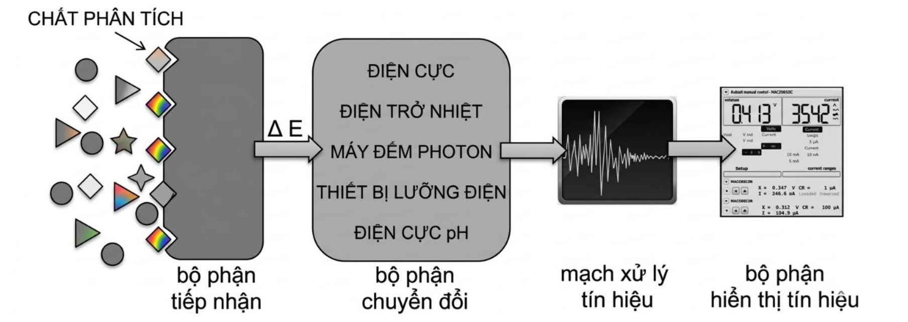 (3) Nhóm cảm biến hóa học (Chemical sensors): chuyển đổi các tương tác hóa học trên bề mặt bao bì thành tín hiệu điện có thể đo lường được. Hệ thống gồm bộ phận tiếp nhận (receptor) tương tác với chất phân tích và bộ chuyển đổi (transducer) để tạo ra tín hiệu. Cảm biến hóa học giúp định lượng các khí phát sinh khi thực phẩm hư hỏng (như NH3, H2S) hoặc phát hiện các chất độc hại di trú từ bao bì (như BPA). Trong đó, cảm biến sinh học là một dạng đặc biệt của cảm biến hóa học, sử dụng các tác nhân như kháng thể hoặc enzyme để nhận diện chính xác vi khuẩn gây bệnh (E. coli) và độc tố nấm mốc. Có thể kể đến việc ứng dụng công nghệ nano đang giúp các cảm biến này đạt độ nhạy cực cao.