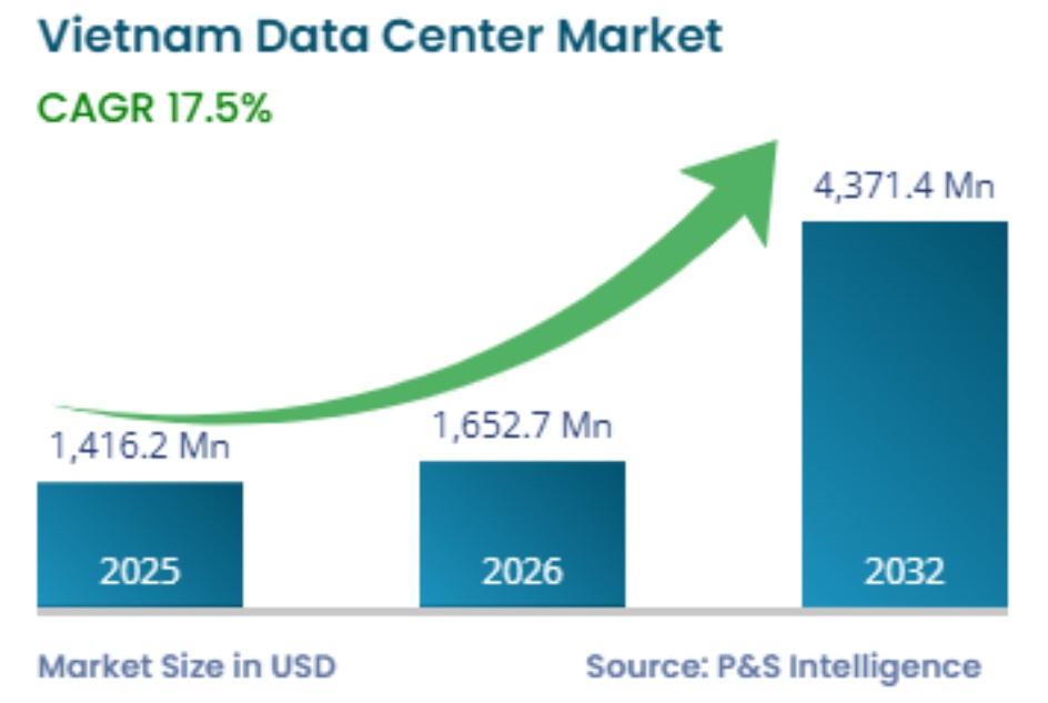 Quy mô thị trường TTDL tại Việt Nam (Nguồn: Vietnam Data Center Market Size & Share Analysis - Emerging Trends, Growth Opportunities, Competitive Landscape, and Forecasts (2026–2032) (P&S Intelligence, 2026))