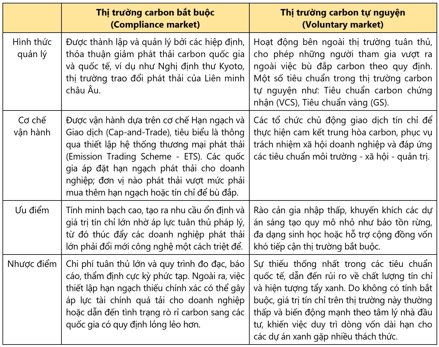 Thị trường carbon (hay thị trường mua bán tín chỉ carbon) là lĩnh vực mua bán khí thải, được thiết lập nhằm tạo cơ chế linh hoạt trong giảm khí thải nhà kính. Theo tham luận “Thị trường carbon và việc tổ chức, phát triển thị trường carbon hiện nay” công bố năm 2023 trên Tạp chí Khoa học Xã hội và Nhân văn, thị trường carbon trên thế giới tồn tại dưới hai hình thức: (1) Thị trường carbon bắt buộc (Compliance Market) và (2) Thị trường carbon tự nguyện (Voluntary Market), với các đặc trưng sau: