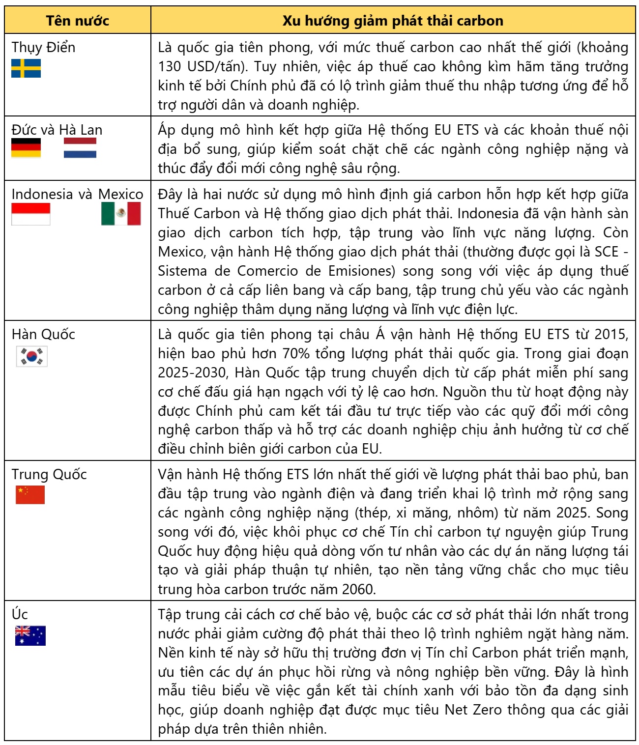 Kể từ Thỏa thuận Paris (2015), thị trường carbon đã chuyển dịch mạnh mẽ từ các cam kết tự nguyện sang cơ chế tuân thủ bắt buộc. Với hạt nhân là hệ thống Hạn ngạch và Giao dịch, tiêu biểu như Hệ thống Thương mại Khí thải của Liên minh Châu Âu (European Union Emissions Trading System - EU ETS). Việc giảm phát thải không còn là lựa chọn mà đã trở thành trách nhiệm giải trình thực chất. Báo cáo Effective Carbon Rates 2025 của tổ chức Hợp tác và Phát triển Kinh tế (Organization for Economic Cooperation and Development - OECD) đã cho thấy một bức tranh đa dạng về xu hướng giảm phát thải carbon của các quốc gia dẫn đầu thế giới: