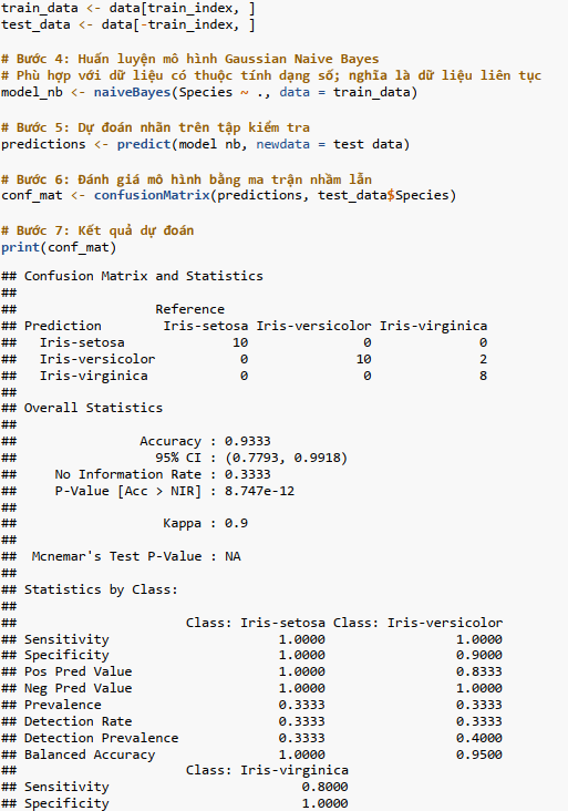 Diễn giải kết quả: Mô hình Gaussian Naive Bayes trên tập test có độ chính xác (accuracy) 93.33%.