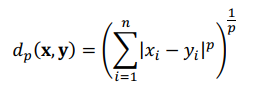Khoảng cách Minkowski giữa hai điểm x và y trong không gian n chiều với trọng số p≥1 là: