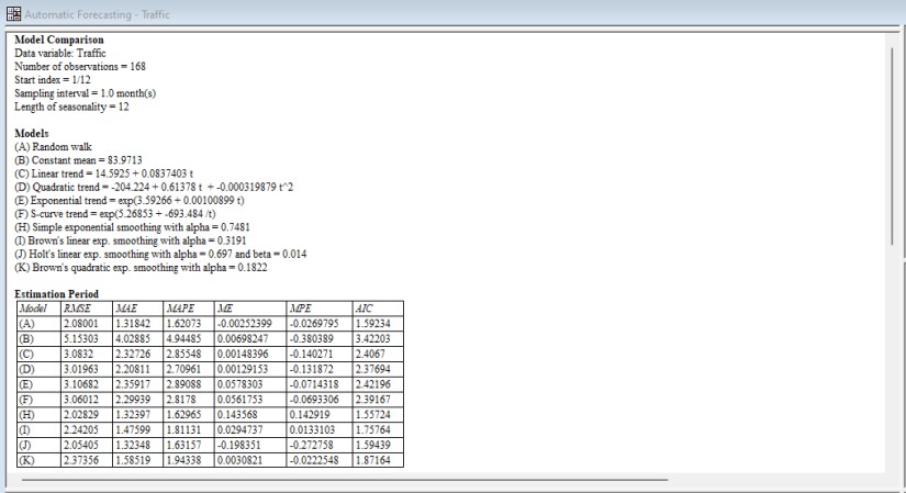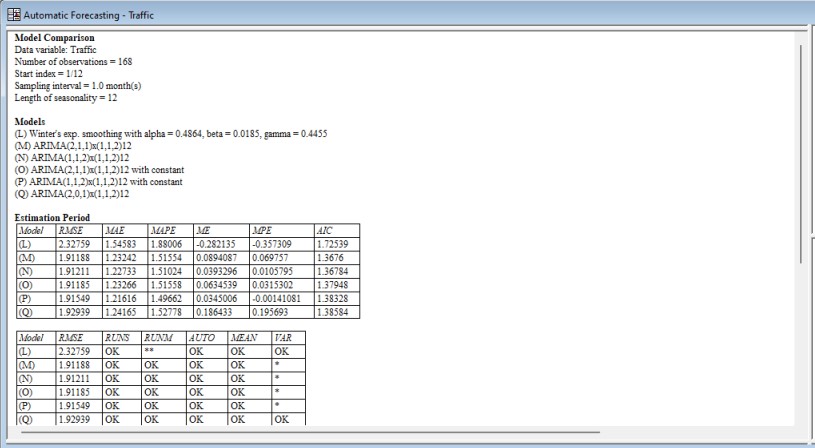 Model (L) là quy trình của Winter, ba tham số làm mịn hàm mũ, α, β và γ, đã được tối ưu hóa bằng cách giảm thiểu sai số dự báo bình phương trung bình. Các mô hình (M) đến (Q) đại diện cho 5 mô hình ARIMA tốt nhất. Để xếp hạng mức độ phù hợp của các mô hình, tiêu chí thông tin (AIC) dự báo một khoảng thời gian được tính: