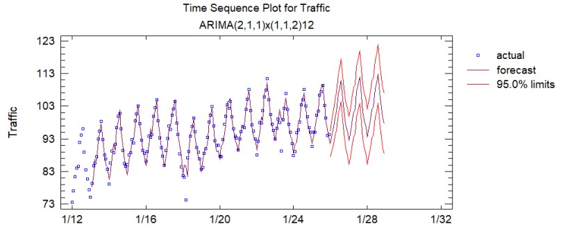 Theo AIC, mô hình (M) là tốt nhất. Các dự báo từ mô hình này được hiển thị trên biểu đồ trình tự thời gian:
