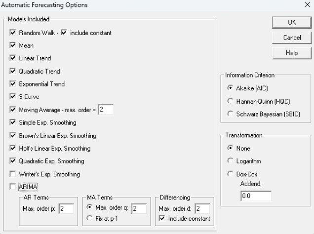 Hình 12: Hộp thoại tùy chọn phân tích với lựa chọn các mô hình không theo mùa