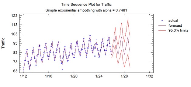 Hình 14: Dự báo từ phương pháp làm mịn số mũ đơn giản trên dữ liệu đã điều chỉnh theo mùa