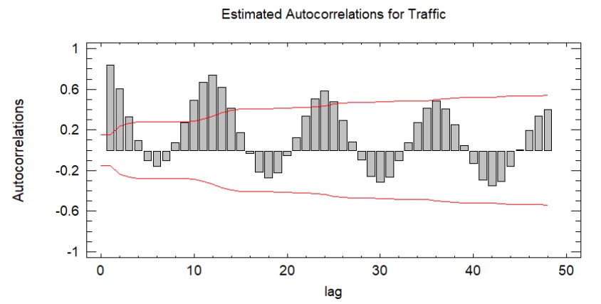 Tự tương quan tại độ trễ k là mức tương quan giữa các quan sát cách nhau k khoảng thời gian. Một giá trị dương lớn tại độ trễ 1 cho thấy các quan sát liền kề có xu hướng tương đồng. Mặc dù tương quan giảm dần khi khoảng cách tăng, nhưng lại tăng trở lại tại các độ trễ 12, 24, 36 và 48 tháng phản ánh tính lặp lại theo năm, cho thấy rõ tính thời vụ 12 tháng.