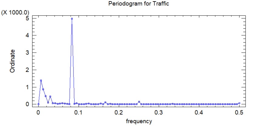Biểu đồ tần số (periodogram) giúp nhìn thấy được mức độ ảnh hưởng của các dao động ở những tần số khác nhau đến sự biến động chung của chuỗi dữ liệu theo thời gian. Biểu đồ được tạo ra nhờ phân tích Fourier, trong đó, dữ liệu được tách thành các sóng hình sin. Dữ liệu có yếu tố chu kỳ rõ rệt sẽ xuất hiện một đỉnh lớn trên biểu đồ. Bên cạnh đó, cũng có thể thấy những đỉnh nhỏ hơn tại các bội số của tần số đó (gọi là sóng điều hòa), cho thấy dao động theo mùa không hoàn toàn đều đặn.