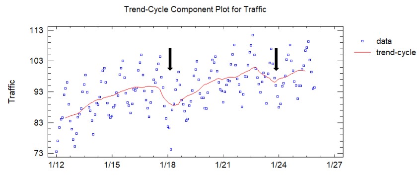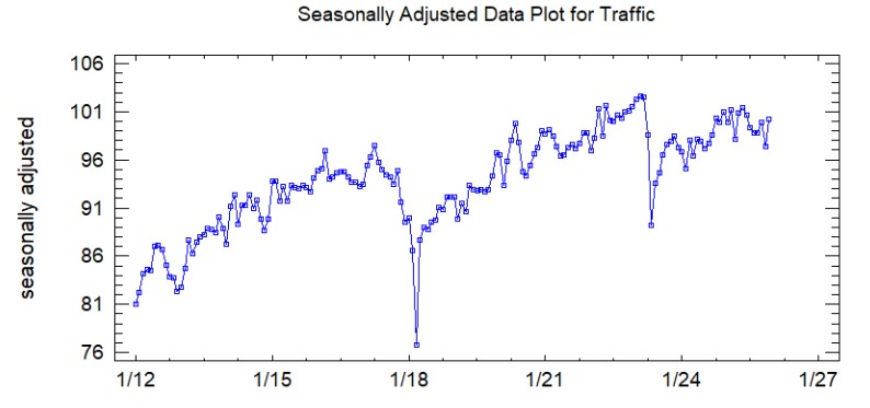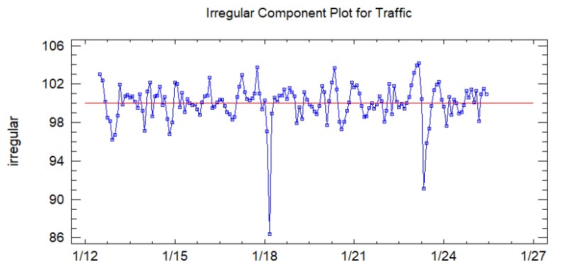 Trong mô hình nhân, thành phần không đều được biểu diễn dưới dạng phần trăm, vào tháng 3 năm 2017, thành phần này giảm còn khoảng 86%, cho thấy lưu lượng giao thông thấp hơn khoảng 14% so với mức dự kiến. Khi quá trình phân tách đã được thực hiện, có thể lấy dữ liệu gốc và chia nó cho các chỉ số theo mùa ước tính để thu được dữ liệu được điều chỉnh theo mùa Yt′, với ![]()