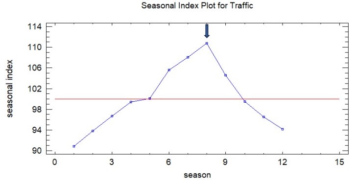 Các chỉ số theo mùa ước tính thành phần mùa vụ St. Khi sử dụng mô hình nhân, các chỉ số được biểu thị trên cơ sở tỷ lệ phần trăm. Tác động mạnh mẽ theo mùa đối với dữ liệu giao thông, tăng từ mức thấp trong Tháng 1 lên mức cao nhất vào Tháng 8 và sau đó lại giảm xuống.