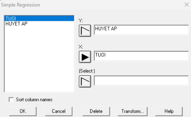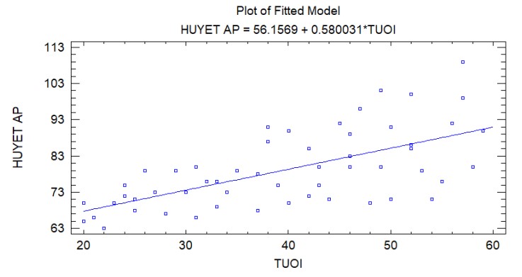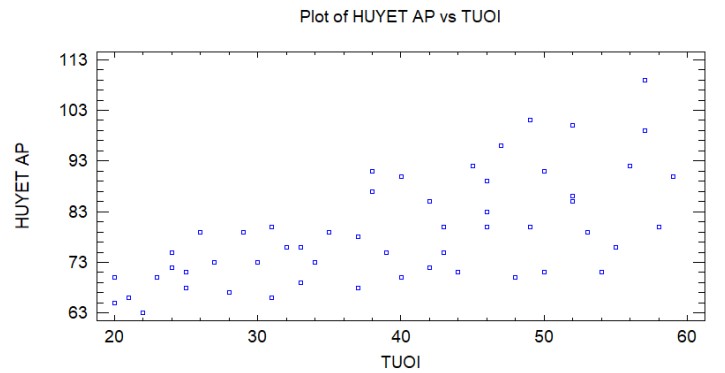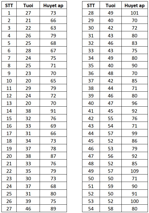 Ví dụ: Nghiên cứu trên 54 phụ nữ từ 20 đến 60 tuổi, với mục tiêu xác định mối quan hệ giữa huyết áp và tuổi tác, có bảng số liệu như Hình 1.