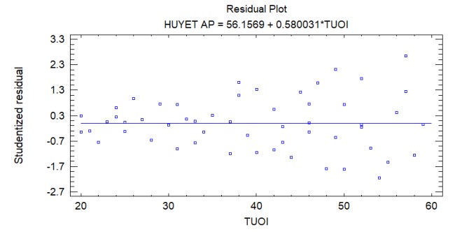 Biểu đồ cho thấy, sự biến đổi của huyết áp có xu hướng tăng đáng kể khi tuổi tác tăng lên, đồng thời sai số cũng tăng lên cho thấy mô hình ban đầu có hiện tượng phương sai sai số thay đổi.
