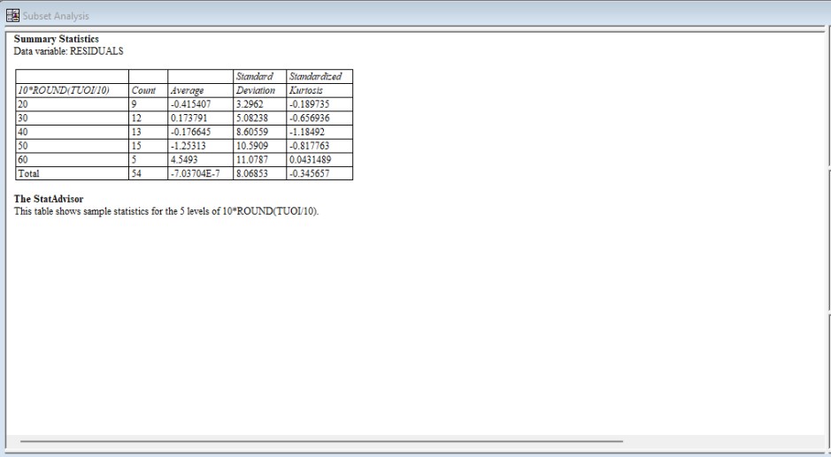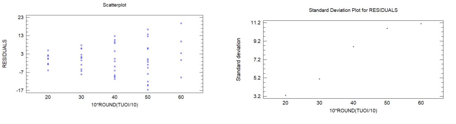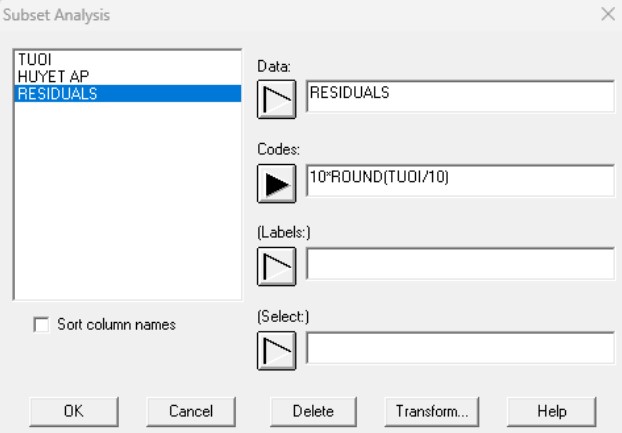 Hình dạng phễu lớn, biểu thị phương sai sai số tăng khi độ tuổi tăng. Để mô hình hóa phương sai, tiến hành lưu kết quả, chia dữ liệu thành nhiều nhóm theo giá trị tuổi và ước tính độ lệch chuẩn trong mỗi nhóm. Chọn: Describe – Numeric Data – Subset Analysis.