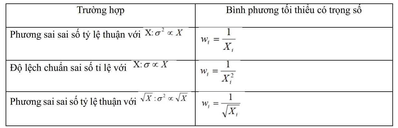 Bằng cách sử dụng các trọng số wi tỷ lệ với phương sai sai số, tác động của phương sai thay đổi có thể giảm nhẹ. Một số trường hợp thường gặp là: