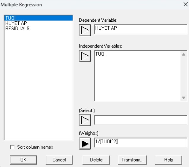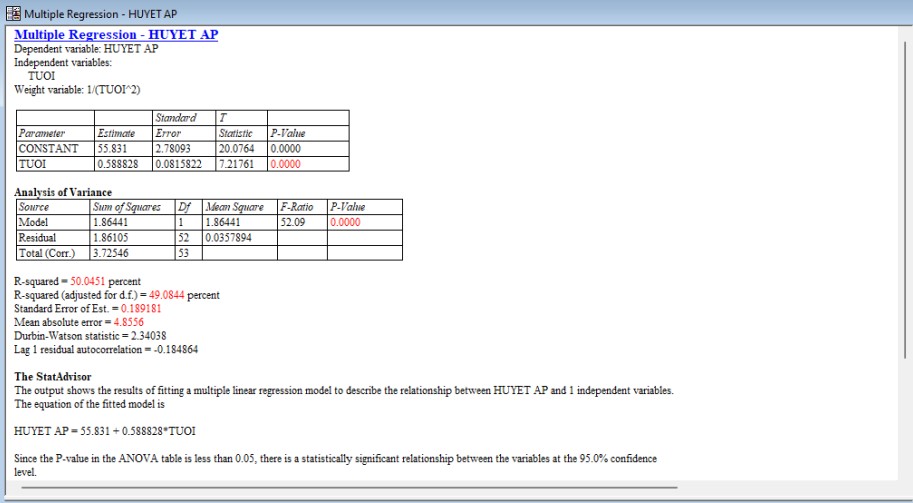 Hồi quy bội để điều chỉnh mô hình hồi quy bằng cách sử dụng bình phương tối thiểu có trọng số trong Statgraphics Centurion: Chọn Relate – Multiple Factors – Multiple Regression.