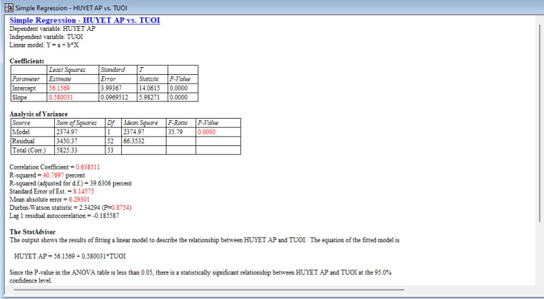 Các hệ số mô hình ước lượng và sai số chuẩn là: Intercept: 56.1569 ± 3.99367; Slope: 0.580031 ± 0.0969512.