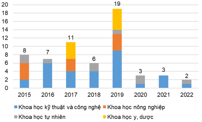 Biểu đồ 4 thể hiện cơ cấu nhiệm vụ nghiên cứu KH&CN theo từng lĩnh vực trong giai đoạn 2015-2024, được thống kê dựa trên năm bắt đầu thực hiện nhiệm vụ (gồm cả những nhiệm vụ đã hoàn thành và những nhiệm vụ hiện đang triển khai). Xét theo thời gian, trong suốt giai đoạn 2015-2024, các nhiệm vụ thuộc lĩnh vực Khoa học kỹ thuật và công nghệ luôn chiếm tỷ trọng lớn nhất và đạt đỉnh cao nhất vào năm 2019 với 9 nhiệm vụ. Từ sau năm 2020, số lượng nhiệm vụ bắt đầu mới ở hầu hết các lĩnh vực có xu hướng giảm.