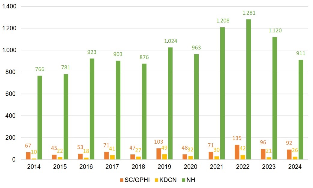 Xét số lượng hợp đồng đã đăng ký, trong suốt giai đoạn 2014-2024, số lượng hợp đồng chuyển nhượng quyền sở hữu luôn vượt xa hợp đồng chuyển giao quyền sử dụng. Về chuyển nhượng quyền sở hữu, số lượng hợp đồng có xu hướng tang, từ 843 hợp đồng (2014) đến đỉnh 1.458 hợp đồng (2022), sau đó giảm còn 1.029 hợp đồng (2024). Về chuyển giao quyền sử dụng, số lượng hợp đồng khá ít so với chuyển nhượng quyền sở hữu, cao nhất là 239 hợp đồng (2018), thấp nhất 103 hợp đồng (2024).