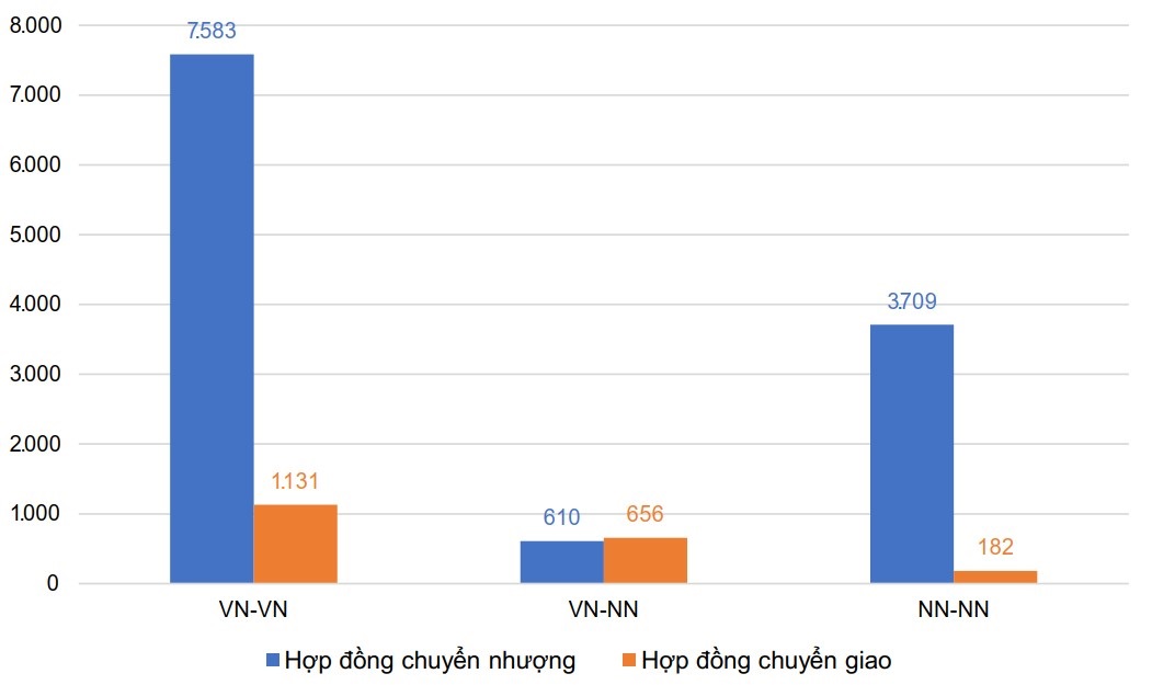 Xét theo nhóm chủ thể ký kết, số liệu của Cục Sở hữu trí tuệ cho thấy các giao dịch giữa người Việt Nam với người Việt Nam chiếm ưu thế tuyệt đối ở cả hợp đồng chuyển nhượng quyền sở hữu và chuyển giao quyền sử dụng. Điều này cho thấy thị trường giao dịch quyền sở hữu công nghiệp ở Việt Nam hiện vẫn chủ yếu xoay quanh các giao dịch trong nước. Các hợp đồng có yếu tố nước ngoài tuy chiếm tỷ lệ chưa nhiều, nhưng lại mang tiềm năng lớn nhờ cơ hội tiếp cận công nghệ, thương hiệu và nguồn lực mới. Đây là mảng thị trường có thể khai thác mạnh hơn trong thời gian tới, vừa để thu hút đầu tư và công nghệ từ bên ngoài, vừa để hỗ trợ doanh nghiệp Việt đưa tài sản trí tuệ ra thế giới.