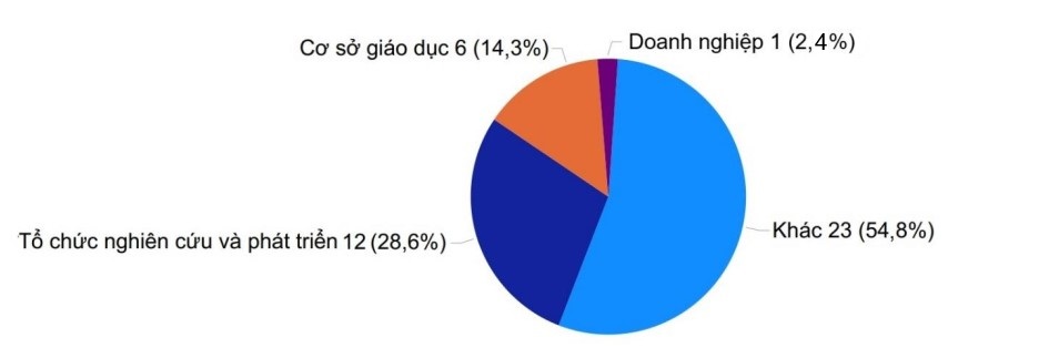 Theo loại hình tổ chức, nổi bật là nhóm tổ chức khác (Bộ, Sở, Ban, Ngành và đơn vị trực thuộc) chiếm 54,8% và nhóm tổ chức nghiên cứu và phát triển (Viện nghiên cứu, Trung tâm nghiên cứu) chiếm 28,6%, với tổng cộng 35 nhiệm vụ (83,4%). Các cơ sở giáo dục (Học viện, trường Đại học) và doanh nghiệp chỉ tham gia ở mức hạn chế, lần lượt chiếm 14,3% và 2,4%, cho thấy sự tham gia của các cơ sở giáo dục và doanh nghiệp vào nghiên cứu TMĐT còn khá khiêm tốn.