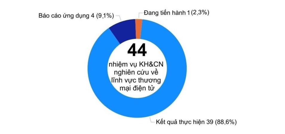 Các nhiệm vụ nghiên cứu liên quan đến lĩnh vực TMĐT trong giai đoạn 2014 - 2024 được phân loại theo ba nhóm trạng thái, bao gồm: nhiệm vụ đang tiến hành (Đang tiến hành), nhiệm vụ đã có kết quả thực hiện (Kết quả thực hiện) và nhiệm vụ có kết quả được ứng dụng vào thực tiễn (Báo cáo ứng dụng). Theo đó, trong giai đoạn 2014 - 2024 đã có 44 nhiệm vụ đã được triển khai, bao gồm 39 nhiệm vụ có kết quả thực hiện, 4 nhiệm vụ có kết quả được ứng dụng và 1 nhiệm vụ vẫn đang trong quá trình triển khai.