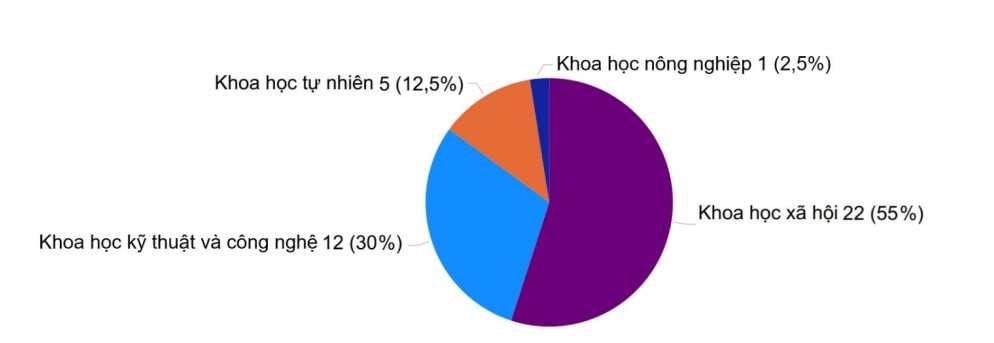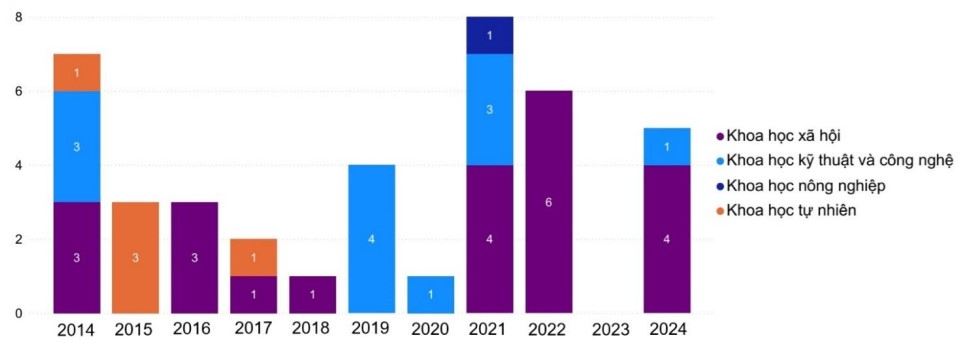 Theo lĩnh vực nghiên cứu, khoa học xã hội chiếm ưu thế nổi bật trong nhiều năm, đặc biệt từ năm 2021 với sự gia tăng đột biến (4 nhiệm vụ năm 2021, 2024 và 6 nhiệm vụ năm 2022). Đáng chú ý, đây cũng là lĩnh vực duy nhất ghi nhận sự gia tăng liên tục về số lượng nhiệm vụ trong hai năm kế tiếp, trong khi các lĩnh vực khác không ghi nhận xu hướng tương tự. Khoa học kỹ thuật và công nghệ giữ vai trò quan trọng nhưng phân bố không đều, nổi bật ở các năm 2014, 2019 và 2021. Ngược lại, khoa học tự nhiên chỉ xuất hiện trong giai đoạn đầu (2014 - 2017) và khoa học nông nghiệp rất ít được quan tâm (chỉ 1 nhiệm vụ năm 2021).