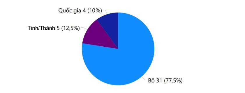 Theo cấp quản lý, các nhiệm vụ được triển khai chủ yếu ở cấp Bộ với 31 nhiệm vụ (77,5%), chiếm tỷ lệ áp đảo (chủ yếu là Bộ Công thương và các đơn vị trực thuộc thực hiện). Tiếp đến là cấp Tỉnh/Thành với 5 nhiệm vụ (12,5%), cấp Quốc gia với 4 nhiệm vụ (10%). Điều này cho thấy hoạt động nghiên cứu quy mô quốc gia, địa phương chưa nhiều và ở cấp Cơ sở chưa có nhiệm vụ triển khai nào liên quan đến lĩnh vực TMĐT.
