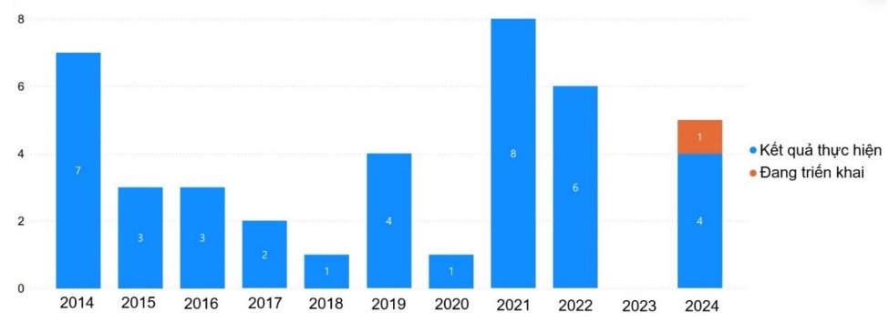 Số liệu thống kê cho thấy hoạt động nghiên cứu về TMĐT giai đoạn 2014 - 2024 có sự biến động rõ rệt. Năm 2014 ghi nhận 7 nhiệm vụ hoàn thành, là năm có số lượng cao nhất trong giai đoạn đầu nhưng từ 2015 đến 2018 số lượng giảm mạnh, chỉ còn 1 - 3 nhiệm vụ mỗi năm. Từ năm 2019 trở đi, số lượng nghiên cứu có chuyển biến tích cực, đặc biệt năm 2021 có 8 nhiệm vụ hoàn thành (cao nhất toàn giai đoạn) và năm 2022 có 6 nhiệm vụ. Mặc dù năm 2023 không ghi nhận nhiệm vụ nào nhưng năm 2024 đã ghi nhận 4 nhiệm vụ hoàn thành và 1 nhiệm vụ đang triển khai, cho thấy xu hướng vẫn ổn định.