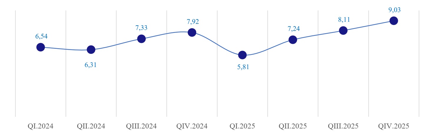 GRDP quý IV năm 2025 của Thành phố tăng 9,03% so với cùng kỳ (không tính dầu khí tăng 9,12%), cao hơn các quý trước (quý I tăng 5,81%; quý II tăng 7,24%; quý III tăng 8,11%). Trong đó, khu vực nông, lâm nghiệp và thủy sản tăng 2,14%; khu vực công nghiệp và xây dựng tăng 8,86%; khu vực dịch vụ tăng 9,44% và thuế sản phẩm trừ trợ cấp sản phẩm tăng 8,34%.