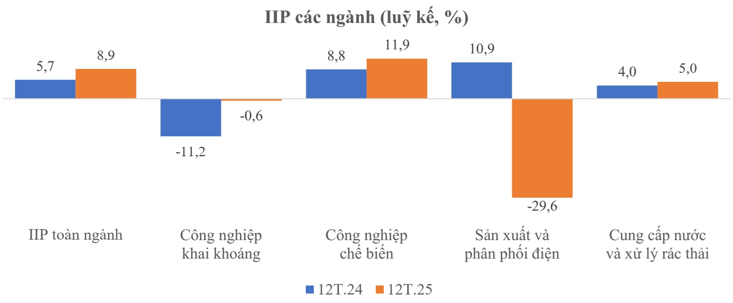 Chỉ số sản xuất công nghiệp năm 2025 ước tăng 8,9% so với năm 2024. Trong đó, công nghiệp chế biến, chế tạo tăng 11,9%; cung cấp nước và xử lý rác thải tăng 5%; sản xuất và phân phối điện giảm 29,6%; công nghiệp khai khoáng giảm 0,6%.