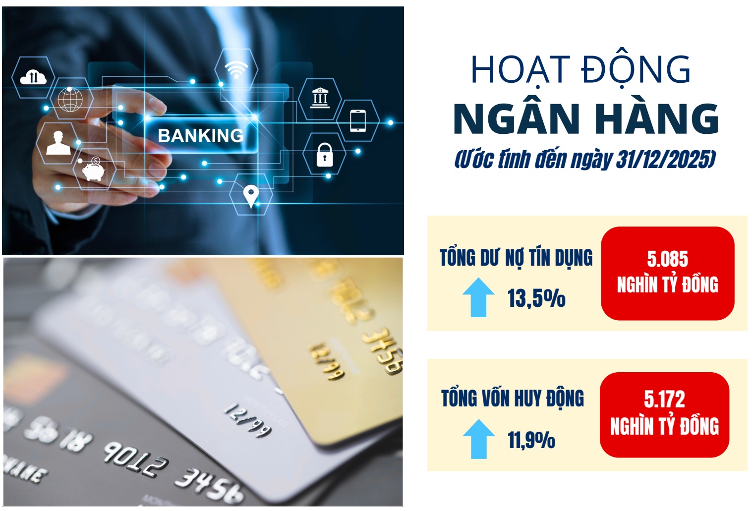 Tổng vốn huy động của các tổ chức tín dụng đến ngày 31/12/2025 ước đạt 5.171,5 nghìn tỷ đồng, tăng 11,9%; tổng dư nợ tín dụng đạt 5.085,1 nghìn tỷ đồng, tăng 13,5% so với cuối năm 2024.