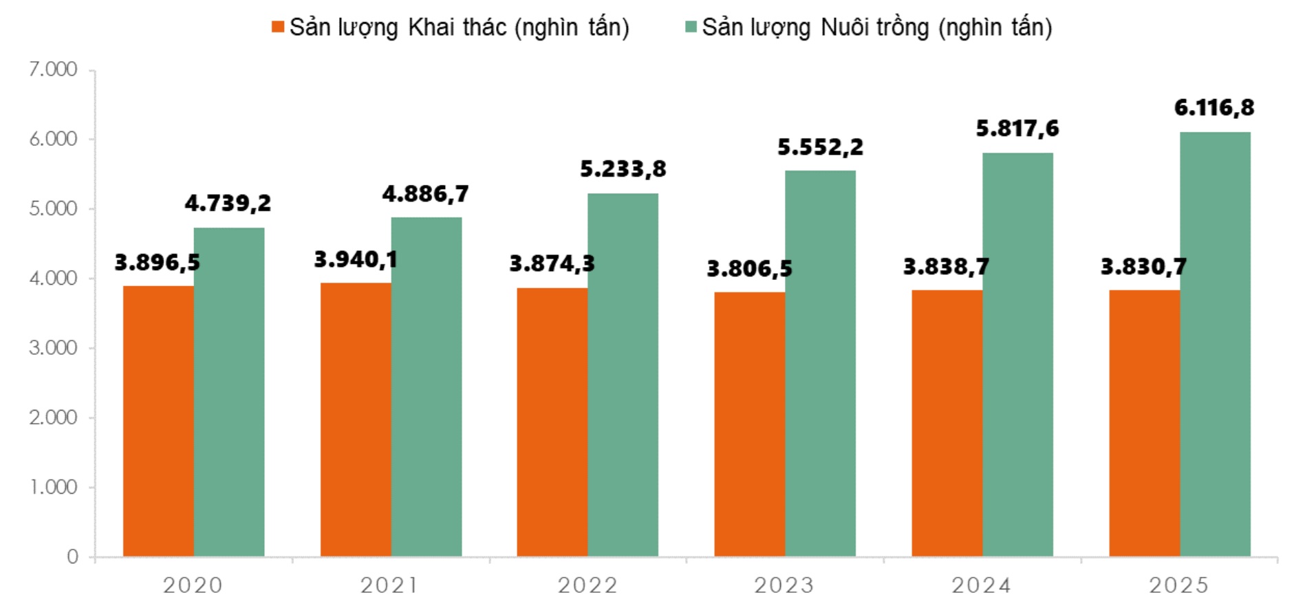 Biểu đồ sản lượng khai thác và nuôi trồng thủy sản giai đoạn 2020-2025